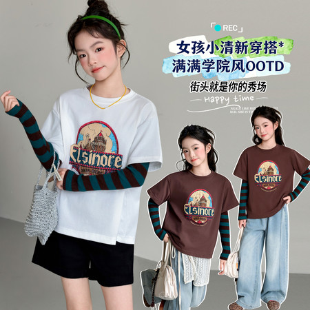1*7下载视频“cjd6016城堡印花假两件条纹袖T恤”